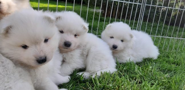 Cuccioli di Spitz Nano Tedesco, piccoli cuccioli di Samoiedo e vivaci cuccioli di Border Collie crescono sani e vivaci